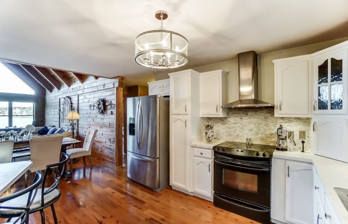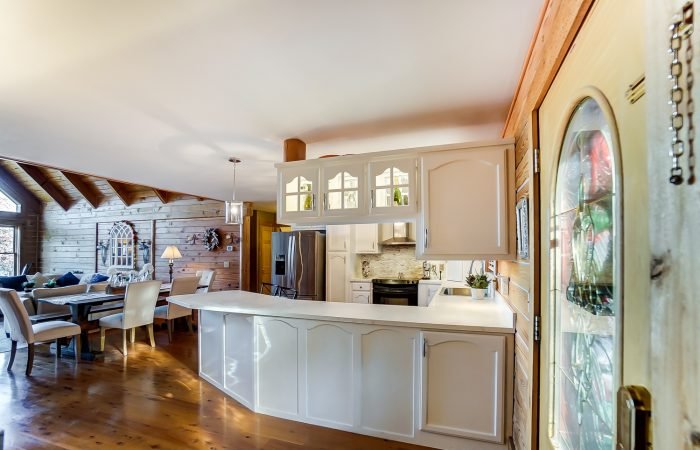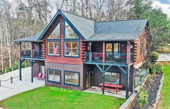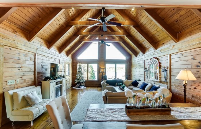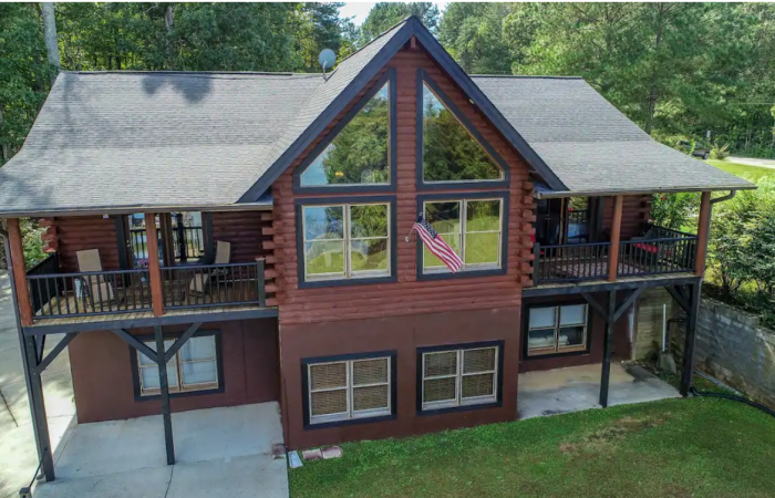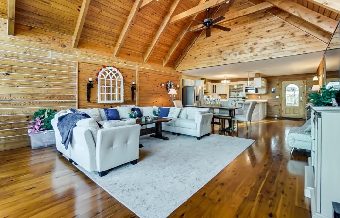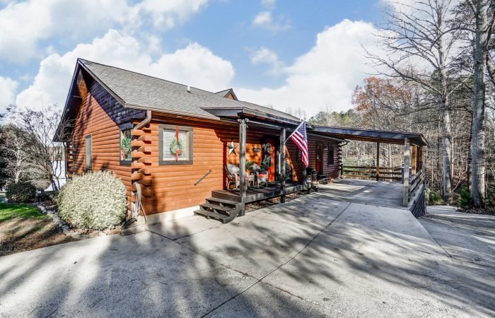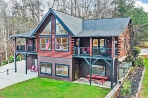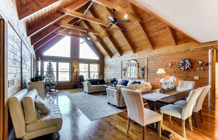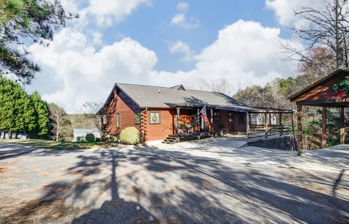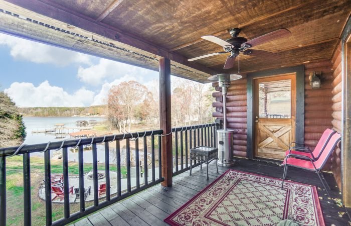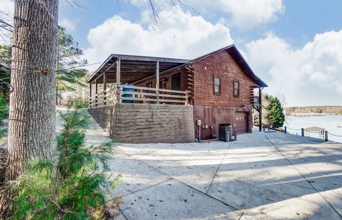 This waterfront log cabin has charm..charm…charm! Desirable open & inviting floor plan provides Amazing lake views from every room. Enjoy morning coffee relaxing on one of your lakefront balconies. Main living level includes master & split bedroom, 2 full baths, kitchen, office and cathedral Greatroom with a wall of windows. Beautiful pine floors throughout the main level.
