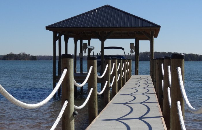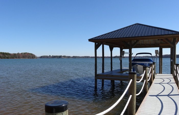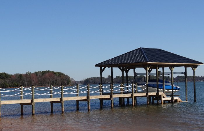 Brand new covered Lancaster Built Dock with cabled boat lift in place ready for you to enjoy now!